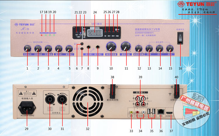 Этот продукт можно перенести обратно для достижения набора систем караоке KTV. Без покупки машины для певца Интернет может поддерживать заказ k. Усилитель имеет встроенное приложение Android System. Используйте пульт дистанционного управления для настройки подключенного Wi -Fi , или непосредственно вставьте сетевой кабель в усилитель питания. Вы можете использовать онлайн -пение k, просто и удобно!