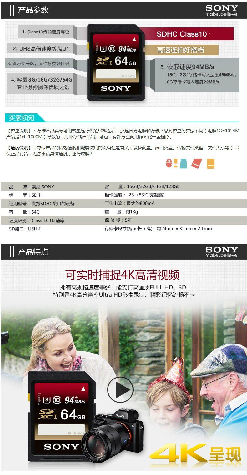 Sony Sony высокоскоростная SD-карта 64g карта памяти камеры Canon Nikon 4K micro SLR карта памяти цифровой камеры A5100L a6000L A6300L A9 A7R3 A7M3