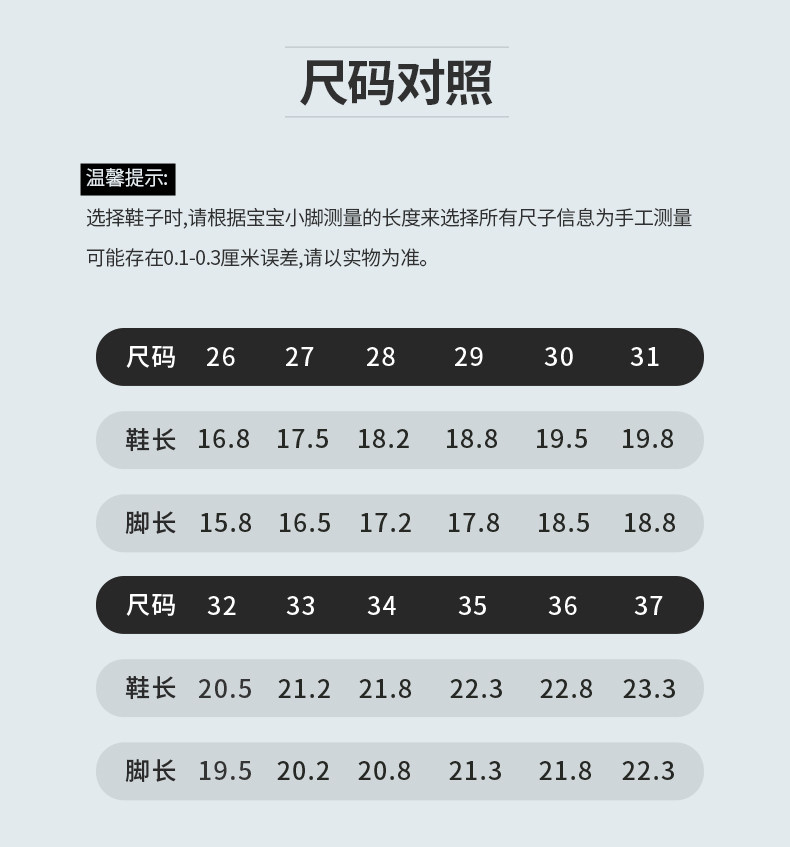 | Размер обуви: | Размер 26 подходит на ногу длиной около 15,8 см., Размер 27 подходит на ногу длиной около 16,5 см., Размер 28, подходит для длины ног приблизительно 17,2 см., 29 ярдов, подходящие по длине около 17,8 см., Размер 30 подходит на ногу длиной около 18,5 см., Размер 31 подходит на ногу длиной около 18,8 см., 32, 19.5см, Размер 33 подходит на ногу длиной около 20,2 см., Размер 34 подходит на ногу длиной около 20,8 см., Размер 35 подходит на ногу длиной около 21,3 см., 36, 21.8см, Размер 37 подходит на ногу длиной около 22,3 см. |