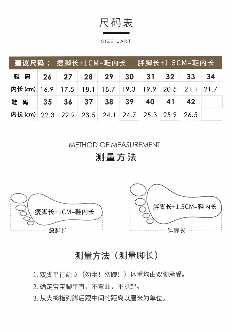 | Размер обуви: | Размер небольшой, пожалуйста, нажмите длину ноги+1 см, чтобы выбрать код, Размер маленький, а ноги широкие и толстые., 27 ярдов/внутренняя длина 17,2 см., 28 ярдов/внутренняя длина 17,8 см, 29 ярдов/внутри 18,5 см, 30 ярдов/внутри 19,5 см, 31 ярды/внутри 20,0 см., Размер 32/внутренняя длина 20,6 см., Размер 33/внутренняя длина 21,1 см., 34 ярда/внутреннее 21,8 см., 35 ярдов/внутри 22,3 см, 36 ярдов/внутри 22,7 см., 37 ярдов/внутри 23,2 см, Размер 38/внутренняя длина 23,7 см., Размер 39/внутренняя длина 24,2 см., Размер 40/внутренняя длина 25,7 см. |