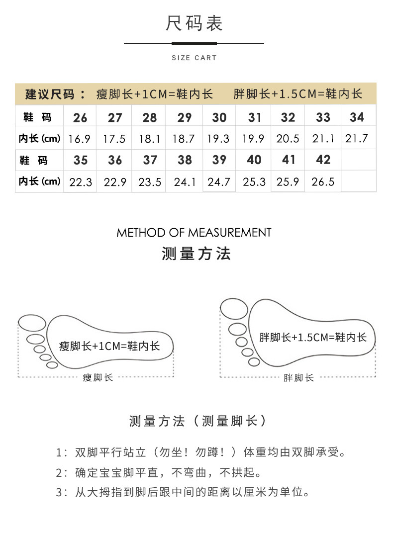 | Размер обуви: | [尺码偏小,瘦脚请按脚长+1cm选码], [尺码偏小,脚宽脚胖按脚长+1.5cm选码], [26码/内长16.4cm], [27码/内长17.0cm], [28码/内长17.8cm], [29码/内长18.5cm], [30码/内长19.0cm], [31码/内长19.7cm], [32码/内长20.4cm], [33码/内长21.0cm], [34码/内长21.7cm], [35码/内长22.2cm], [36码/内长22.8cm], [37码/内长23.3cm], [38码/内长23.8cm], [39码/内长24.3cm], [40码/内长24.8cm], [41码/内长25.2cm], [42码/内长25.7cm] |
