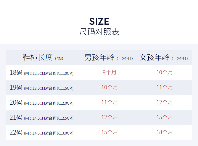 | Размер обуви: | Размер 18, внутренняя длина 12,5 см, подходит на ногу длиной 11,0 см., Размер 19, внутренняя длина 13,0 см, подходит на ногу длиной 11,5 см., Размер 20, внутренняя длина 13,5 см, подходит на ногу длиной 12,0 см., Размер 21, внутренняя длина 14,0 см, подходит на ногу длиной 12,5 см., Размер 22, внутренняя длина 14,5 см, подходит на ногу длиной 13,0 см. |