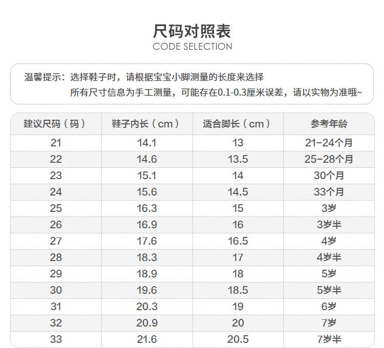 | Размер обуви: | 21 (длина ноги 13/внутри 14.1), 22 (длина футов 13,5/внутри 14,6), 23 (длина ноги 14/внутри 15.1), 24 (длина ноги 14,5/внутри 15,6), 25 (длина ноги 15/внутри 16,3), 26 (длина футов 16/внутри 16,9), 27 (длина футов 16,5/внутри 17,6), 28 (длина ноги 17/внутри 18,3), 29 (длина футов 18/внутри 18,9), 30 (длина футов 18,5/внутри 19,6), 31 (длина футов 19/внутри 20,3), 32 (длина футов 20/внутри 20,9), 33 (20,5/внутри 21,6) |
