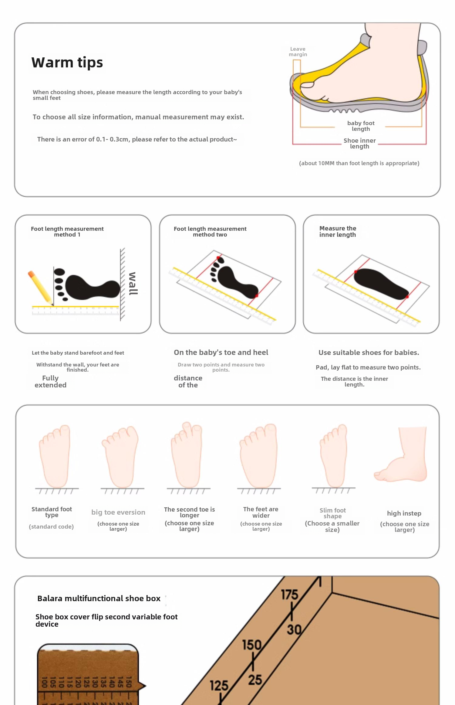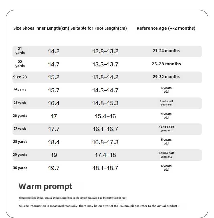 | Размер обуви: | 21 размер, длина ноги 12,8-13,2/внутренняя длина 14.2, 22 размера, длина ноги 13,3-13,7/внутренняя длина 14,7, 23 размера, длина ноги 13,8-14,2/внутренняя длина 15.2, 24 размера, длина ноги 14,3-14,7/внутренняя длина 15,7, 25 размеров, длина ноги 14,8-15,3/внутренняя длина 16,4, 26 размеров, длина ноги 15,4-16/внутренняя длина 17, 27 размеров, длина ноги 16,1-16,7/внутренняя длина 17,7, Размер 28, длина стопы 16,8-17,3/внутренняя длина 18,4., Размер 29, длина стопы 17,4-18/внутренняя длина 19., Размер 30, длина стопы 18,1-18,7/внутренняя длина 19,7., Размер 31, длина стопы 18,8-19,3/внутренняя длина 20,4., Размер 32, длина стопы 19,4-20/внутренняя длина 21., Размер 33, длина стопы 20,1-20,7/внутренняя длина 21,7. |
