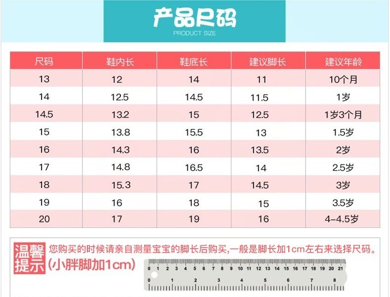 | Размер обуви: | 12см, 11 мес., 12.5см, 1 лет, Внутренняя длина 13,2 см. Стандарт 14,5 ярдов - около 1,5 года, 13.8см, 21 мес., 14.3см, 2 лет, 14.8см, 5 лет, 15.3см, 3 лет, Внутренняя длина 16 см ставки 19 ярдов от 3,5 до 4 лет |