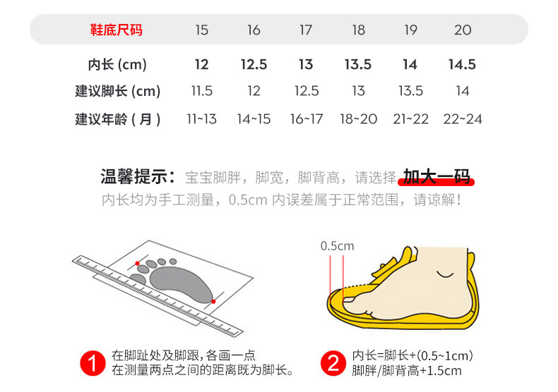 Размер обуви: 15 ярдов (12 см внутрь), 16 ярдов (12,5 см внутри), 17 ярдов (13 см внутри), 18 ярдов (длиной 13,5 см), 19 ярдов (внутренняя длина 14 см), 20 ярдов (14,5 см внутри)