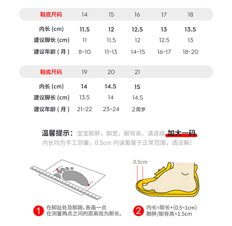 | Размер обуви: | 14 [Внутренняя длина 11,5, рекомендуется 8-10 месяцев], 15 [Внутренняя длина 12, рекомендуется 11-13 месяцев], 16 [Внутренняя длина 12,5, рекомендуется 14-15 месяцев], 17 [Внутренняя длина 13, рекомендуется 16-17 месяцев], 18 [Внутренняя длина 13,5, рекомендуется в течение 18-20 месяцев], 19 [Внутренняя длина 14, рекомендуется 21-22 месяца], 20 [Внутренняя длина 14,5, рекомендовано 23-24 месяца], 21 [Внутри 15, рекомендуется 2 года] |