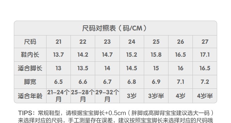 | Размер обуви: | 21 ярды/подходящие длина футов 13 см, 22 ярда/подходящая длина футов 13,5 см, 23 ярда/подходящие длина футов 14 см., 24 ярда/подходящая длина футов 14,5 см, 25 ярдов/подходящих футов в длину 15 см, 26 ярдов/подходящие длина футов 16 см., 27 ярдов/подходящих футов длиной 16,5 см |
