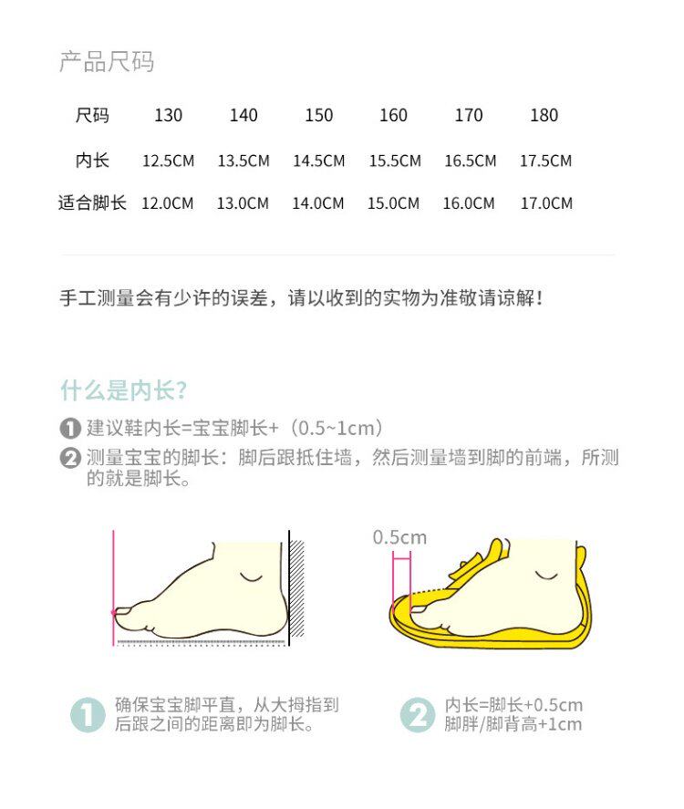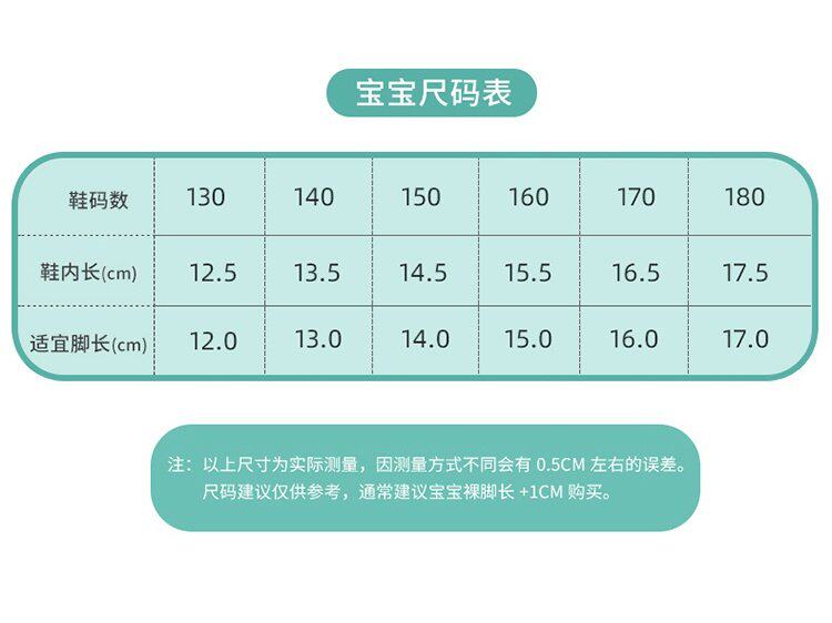 | Размер обуви: | 130 (12,5 см в нем рекомендуется быть 1-1,5 года), 13.5см, 5-2 лет, 150 (внутренняя длина 14,5 см рекомендуется быть 2-2,5 года), 15.5см, 5-3 лет, 16.5см, 3-4 лет, 17.5см, 4-5 лет, [Советы] Рекомендации по возрасту предназначены только для справки, [Совет] Рекомендуется |