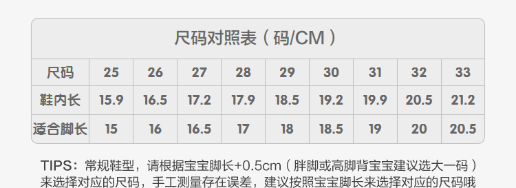 | Размер обуви: | 25 (подходит для стопы длиной 15 см), 26 (подходит для стопы длиной 16 см), 27 (подходит для стопы длиной 16,5 см), 28 (подходит для стопы длиной 17 см), 29 (подходит для стопы длиной 18 см), 30 (подходит для стопы длиной 18,5 см), 31 (подходит для стопы длиной 19 см), 32 (подходит для стопы длиной 20 см), 33 (подходит для стопы длиной 20,5 см) |