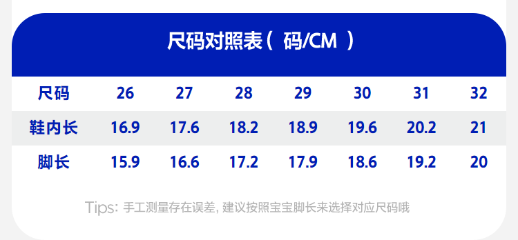 | Размер обуви: | 26 ярдов (подходит для длиной 16 см), 27 ярдов (подходит для длина футов 16,5 см), 28 ярдов (подходит для длиной 17 см), 29 ярдов (подходит для длиной 18 см), 30 ярдов (подходит для длины футов 18,5 см), 31 ярды (подходят для длиной 19 см), 32 ярда (подходит для длиной 20 см) |