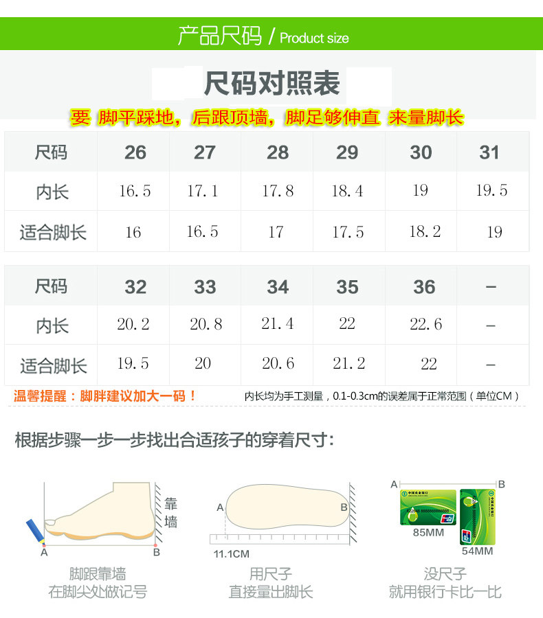 | Размер обуви: | 26 ярдов/внутри 16,5 см, 27 ярдов/внутренний 17,1 см длиной, 28 ярдов/внутренний 17,8 см в длину, 29 ярдов/внутри 18,4 см в длину, 30 ярдов/внутри 19 см в длину, 31 ярды/внутри 19,5 см, 32 ярда/внутри 20,2 см длиной, 33 ярда/внутри 20,8 см в длину, 34 ярда/внутреннее 21,4 см в длину, 35 ярдов/внутри 22 см, 36 ярдов/внутри 22,6 см, Длина ноги плюс от 0,5 до 1 см = длинная в обуви |