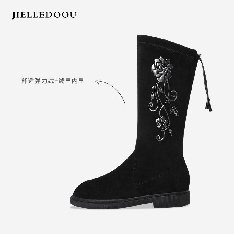 Детские эластичные замшевые высокие сапоги, модная обувь, ботинки, средней длины, 2020, китайский стиль, с вышивкой
