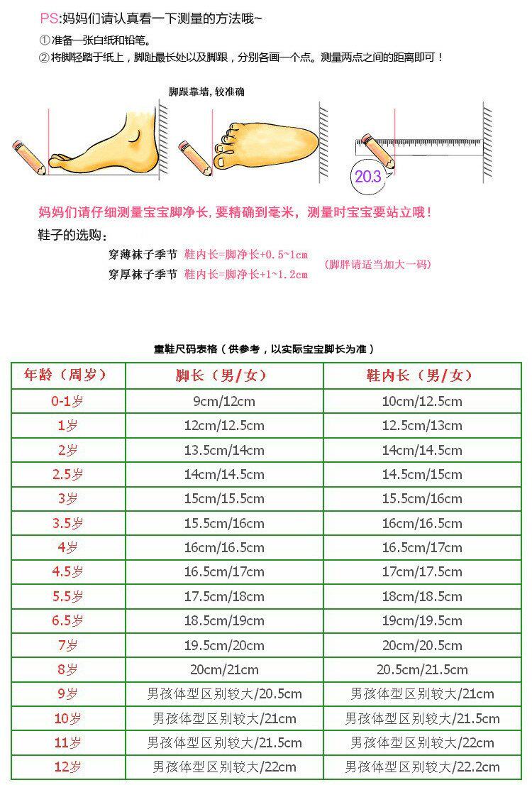 | Размер обуви: | 21 ярды/внутренняя длина 13 см., 13.5см, 23 ярда/внутренняя длина 14 см., 14.5см, Размер 25/внутренняя длина 15 см., 26 ярдов/внутренний 16см, 16.5см, 28 ярдов/внутренняя длина 17 см., 17.5см, 30 ярдов/внутри 18 см, Рекомендуется выбрать внутреннюю длину ног длиной+1 см |