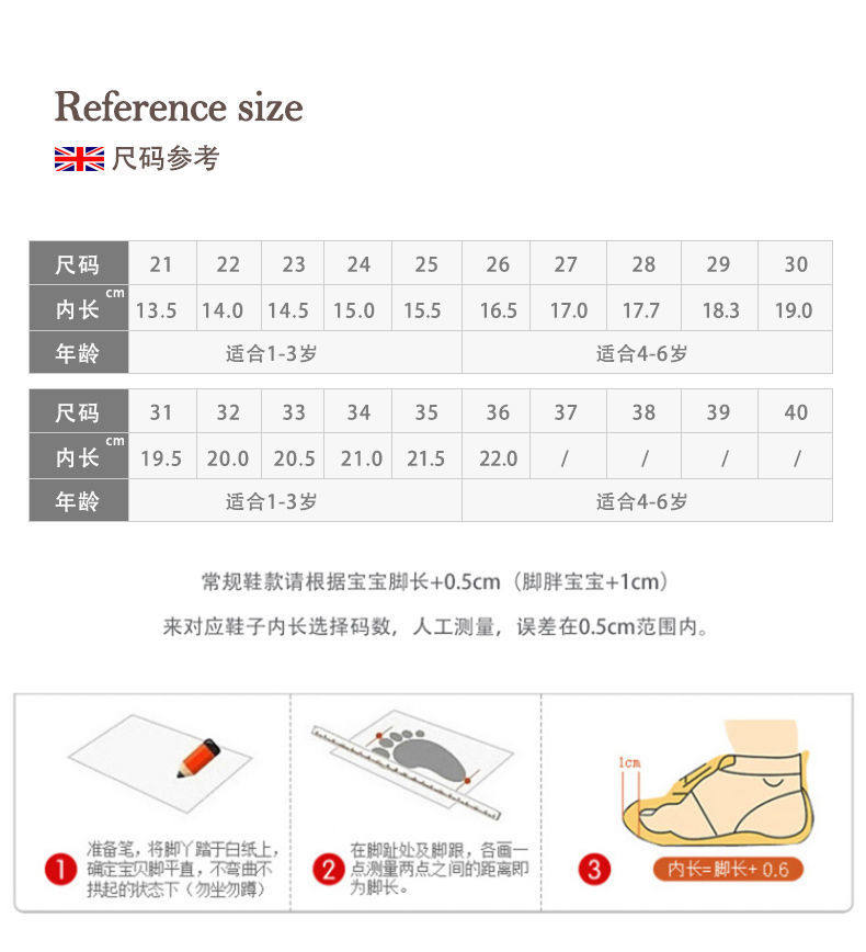 | Размер обуви: | 16.6см, 17.3см, 17.9см, 18.5см, 19.2см, 19.9см, 32, 20.6см, 21.3см, 21.9см, 22.5см, 36, 23.0см, 23.5см, 38, 24.0см |