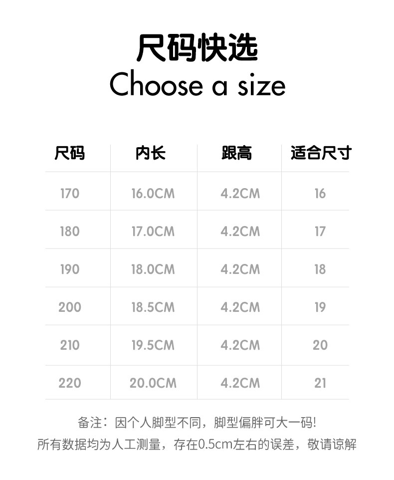 | Размер обуви: | 170 ярдов [внутренняя длина 16,0 см], 180 ярдов [внутренняя длина 17,0 см], 190 код [18,0 см внутри], 200 ярдов [18,5 см внутри], 210 код [19,5 см внутри], 220 ярдов [20 см внутри] |