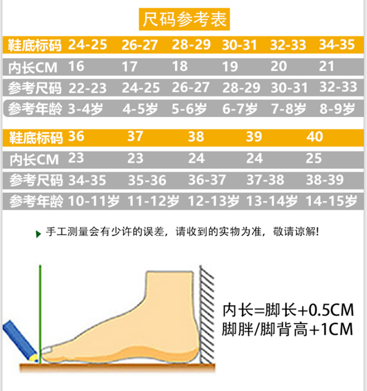 | Размер обуви: | 17 кодов длиной 16 см, 18 ярдов длиной 17 см, 19 ярдов длиной 18 см, 19 см в 20 ярдах, 20 см в 21 ярдах, Длина 22 ярда 21 см, 36 ярдов длиной 22,5 см, 23 см в 37 ярдах, 23,5 см в 38 ярдах, 24 см в 39 ярдах, 24,5 см в 40 ярдах, Как правило, сколько длиной 1,5 см |