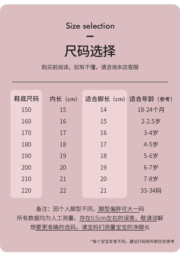 | Размер обуви: | 150 (внутренняя длина 15 см), 160 (внутренняя длина 16 см), 170 (внутренняя длина 17 см), 180 (внутренняя длина 18 см), 190 (внутренняя длина 19 см), 200 (внутренняя длина 20 см), 210 (21см внутрь), 220 (внутренняя длина 22 см) |