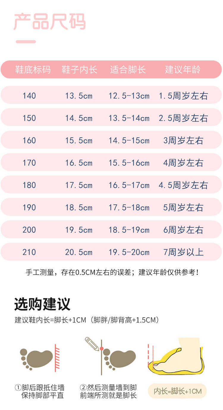 | Размер обуви: | 140 (13,5 см внутрь), 150 (внутренняя длина 14,5 см), 160 (15,5 см внутри), 170 (внутренняя длина 16,5 см), 180 (внутренняя длина 17,5 см), 190 (внутренняя длина 18,5 см), 200 (внутренняя длина 19,5 см), 210 (внутри 20,5 см) |