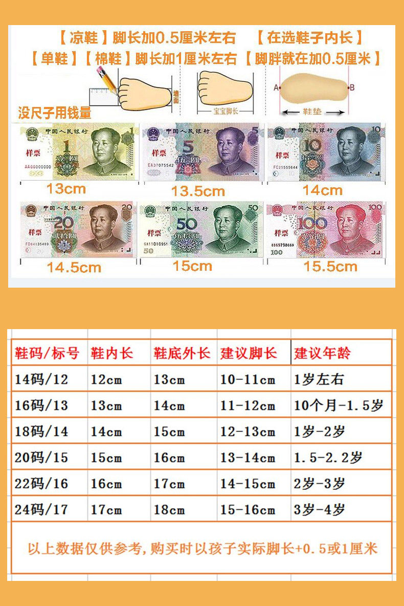 | Размер обуви: | 12см, 7-1 лет, Внутренняя длина 13 см (подходит около 1-1,5 года), Внутренняя длина 14 см (подходит около 1,2-1,8 года), Внутренняя длина 15 см (подходит около 1,8-2,5 года), Внутренняя длина 16 см (подходит около 2,5--3,5 года), Внутренняя длина 17 см (подходит около 3,3-4,5 года) |