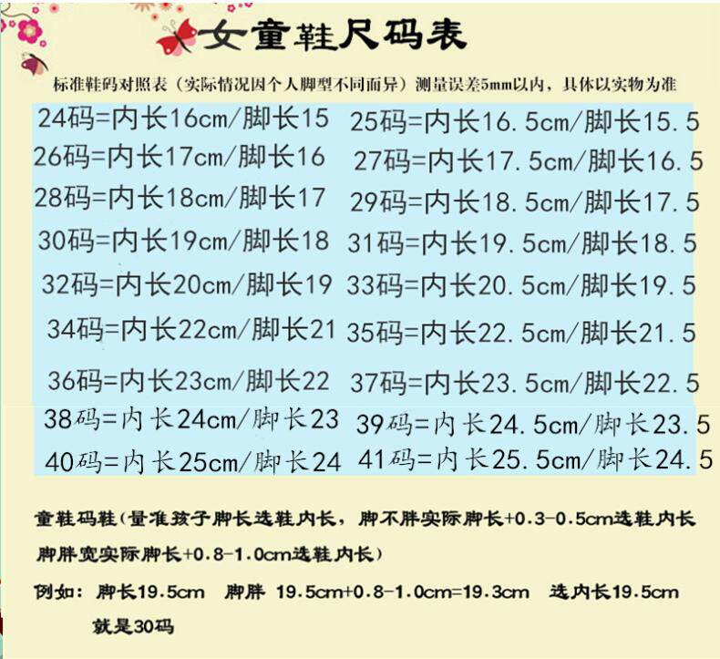 | Размер обуви: | 15.5см, 26 ярдов/футов в длину 16 см., 16.5см, 28 ярдов/футов в длину 17 см., 17.5см, 30 ярдов/футов в длину 18 см., 18.5см, 32, 19см, 19.5см, 34 ярда/футы длиной 20 см, 20.5см, 36, 21см, 21.5см, 38, 22см |