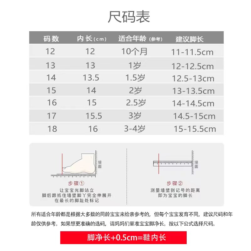 | Размер обуви: | 12см, 10 мес., 13#внутренняя длина 13 см (рекомендуется 1 год), 13.5см, 5 лет, 15#внутренняя длина 14 см (рекомендуется 2 года), 16#15 см в длину (предложение 2,5 года), 15.5см, 3 лет, 16см, 3-4 лет |