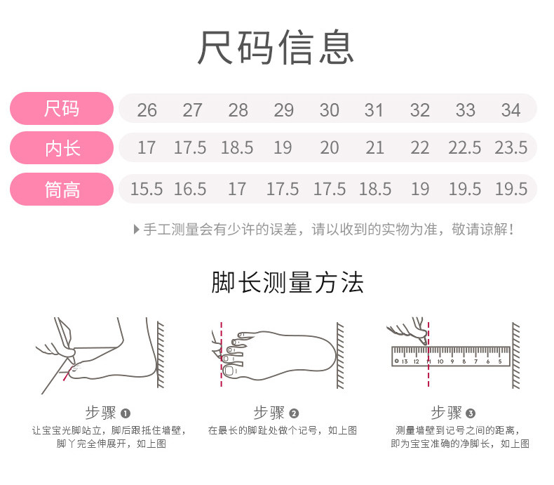 | Размер обуви: | Размер 26, длина внутренней стопы 17см., Размер 27, длина внутренней стопы 17,5 см., Размер 28, длина внутренней стопы 18,5 см., Размер 29, длина внутренней стопы 19см., Размер 30, длина внутренней стопы 20 см., Размер 31 немного больше/внутренняя длина стопы 21 см., Размер 32 немного больше/внутренняя длина стопы 22 см., Размер 33 немного больше/внутренняя длина стопы 22,5 см., Размер 34 немного больше/внутренняя длина стопы 23,5 см. |