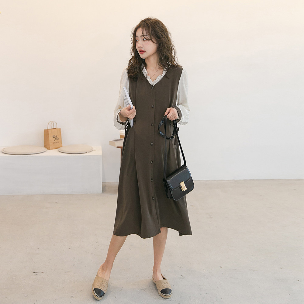 Термобелье, платье для кормящих грудью, длинный шифоновый ремень, осеннее, в корейском стиле, V-образный вырез, средней длины