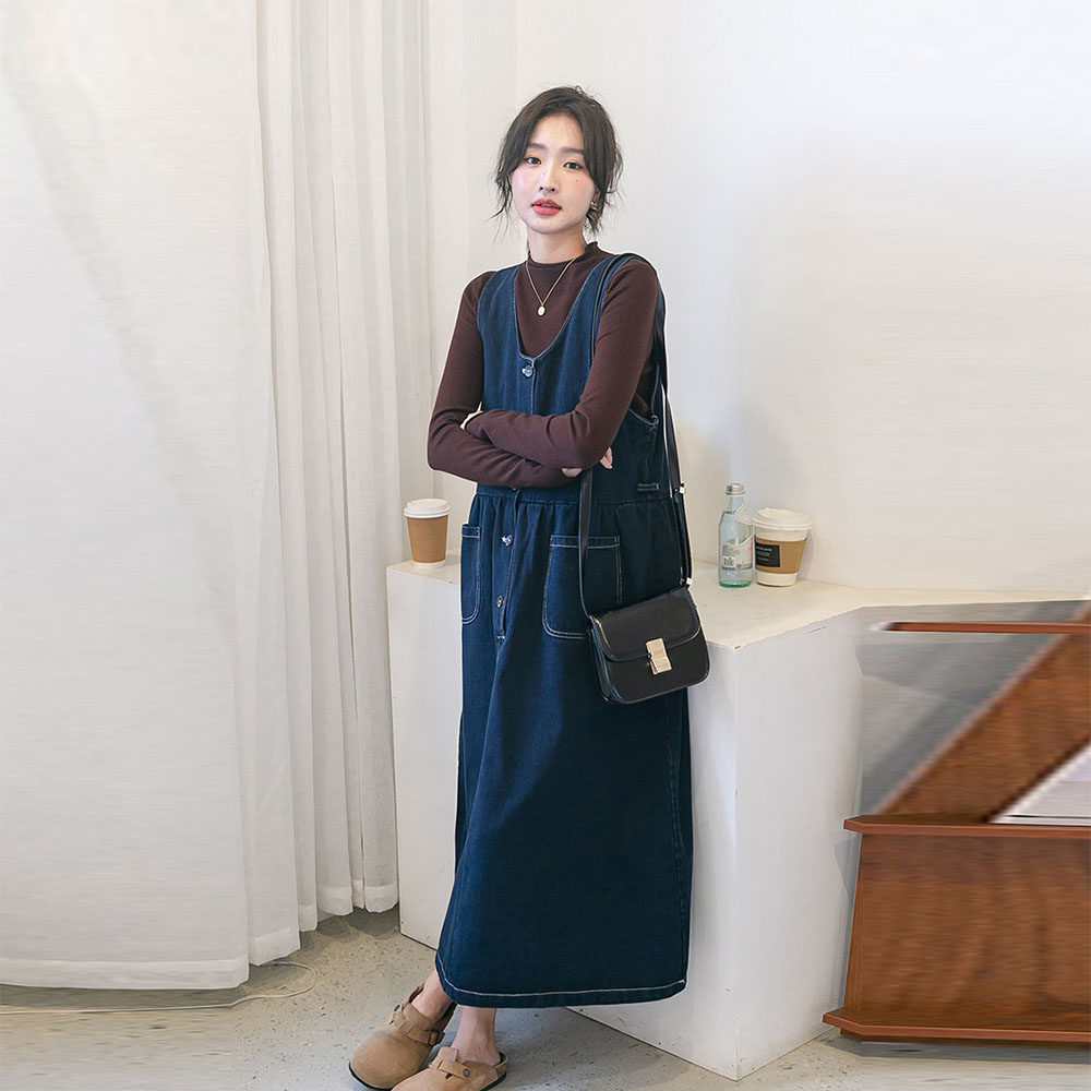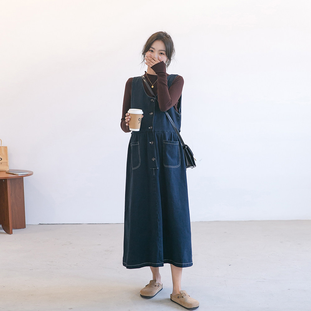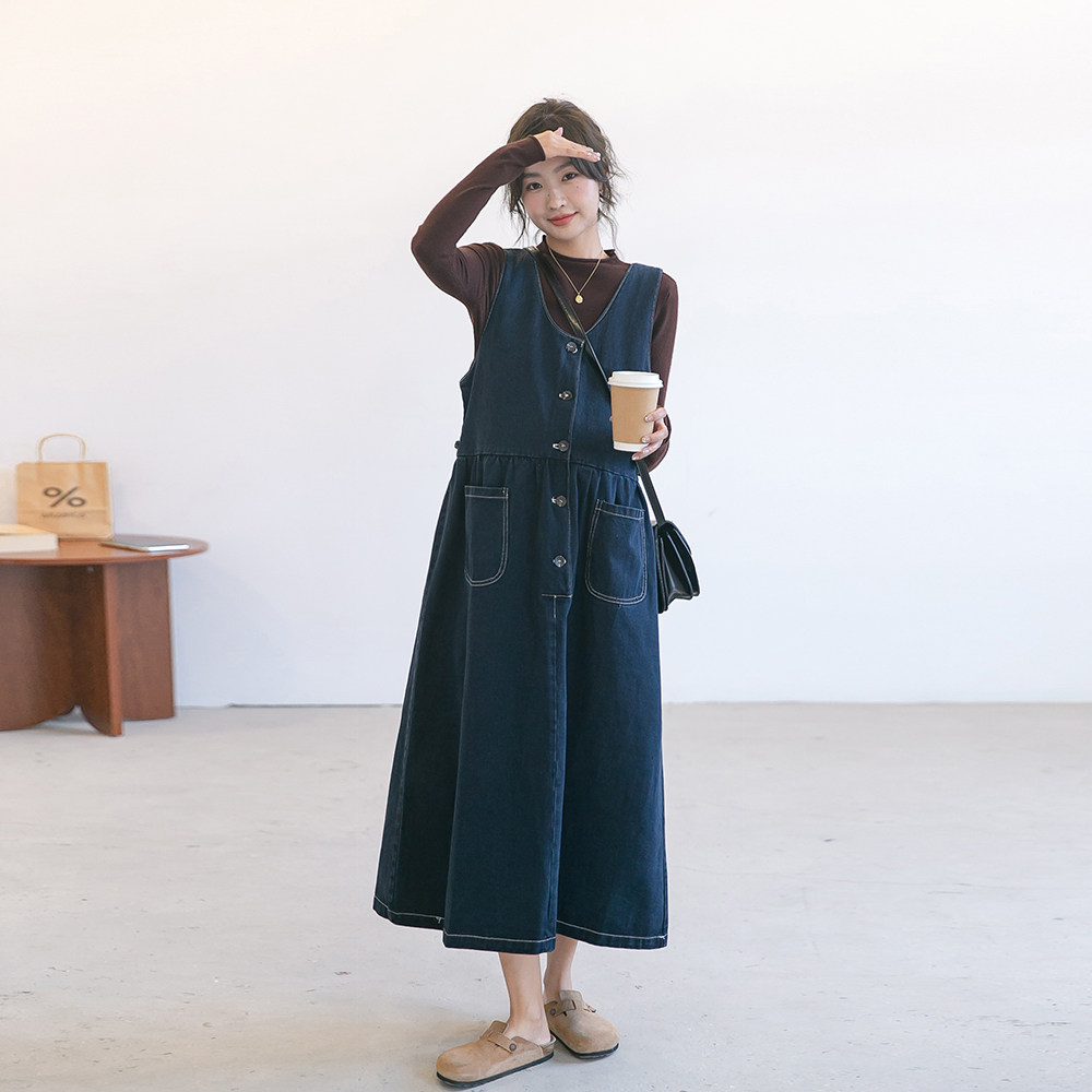 Осеннее платье для беременных, длинная юбка, демисезонный джинсовый сарафан, длина миди, средней длины, V-образный вырез, высокая талия