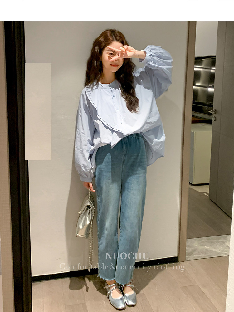 ◆Одежда для беременных Noichu◆Артистичная и элегантная~двухслойная рубашка с длинными рукавами и рюшами с круглым вырезом и стареющий топ