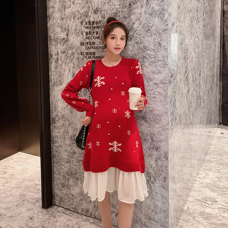 Демисезонный шифоновый красный свитер для беременных, свободный крой, в западном стиле, со снежинками