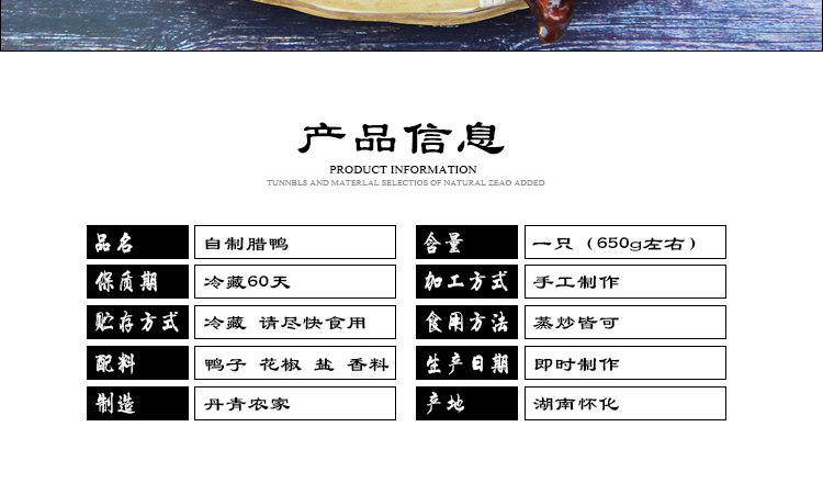 Сырье Danqingjia Duck -это утки Mayang Matta, питаемые в местных сельских районах Mayang, и утка в сельской утечке утки в половине цикла роста.ПересечениеПересечениеПримечание: размер утки обычно составляет около 550G-650G ~
