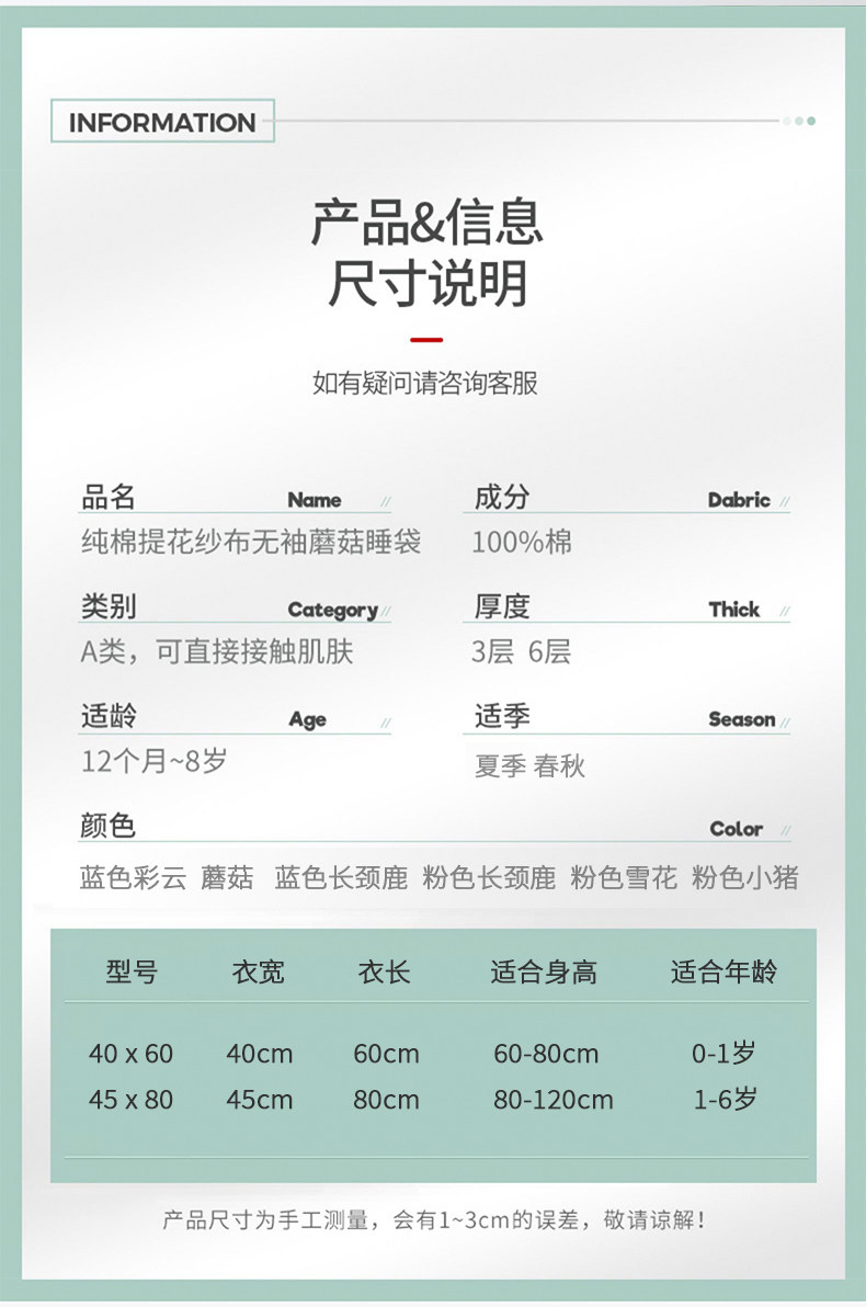 | Цвет: | Трехслойный марлевой спальный мешок (подходит для 25-35 ° C) Грибы, Шестислойный марлевой спальный мешок (подходит для 18-28 ° C) Гриб, Трехслойный марлевой спальный мешок (подходит для 25-35 ° C) Розовая свинья, Шестислойный марлевой спальный мешок (подходит для 18-28 ° C) Голубое цветовое облако, Марлевый синий спальный мешок, жираф, Марлевый розовый спальный мешок, со снежинками |