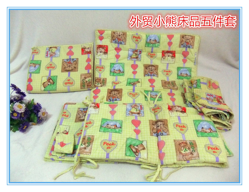 Этот продукт представляет собой набор детских кроватей из пяти частей, в том числе окружность кроватей, детское одеяло, шторы, прокладки мочи, а также подгузники и разные сумки. Он обладает очень экономической эффективностью, с логотипом, отмеченным милым узором.