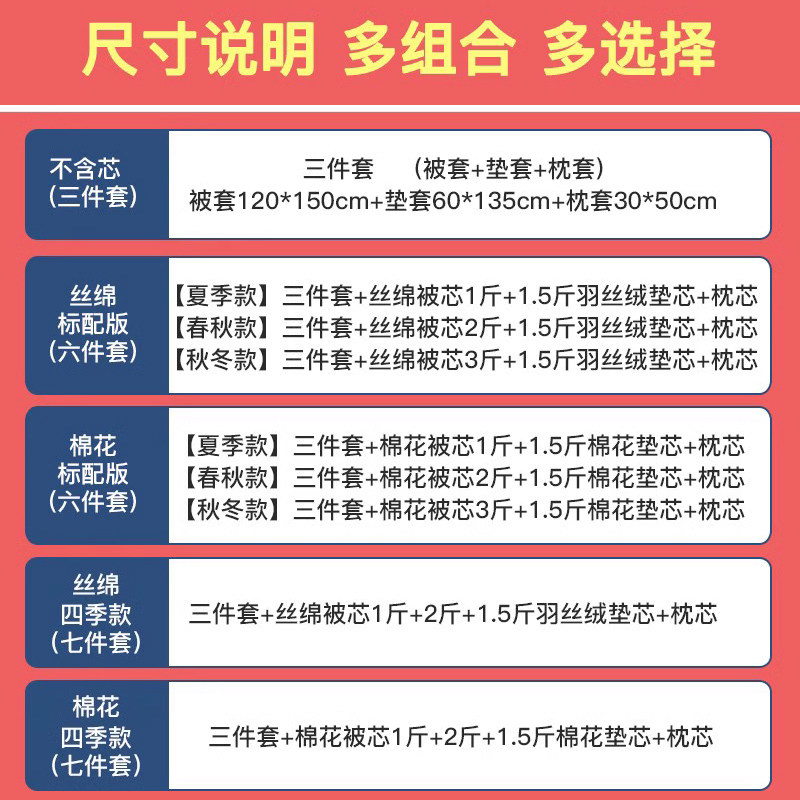 | Размер: | Комплект для детского сада, пододеяльник, матрас, наволочка, 3 предмета, Шесть -завод летом (шелковая модель), Весна и осень шесть -набор (шелковая модель), Шесть -цех, установленные зимой (шелковые модели), Четыре сезона, набор с семью (шелковая модель), Летний хлопковый комплект, Весна и осень шесть -набор (хлопковая модель), Зимний хлопковый комплект, Четыре сезона и семь набор (модель хлопка), Шесть -цех летом (большие бобы), Весна и осень шесть -набор (модель Big Bean), Шесть -цех, установленные зимой (большие бобы), Четыре сезона и семи -набор (большие бобы) |
