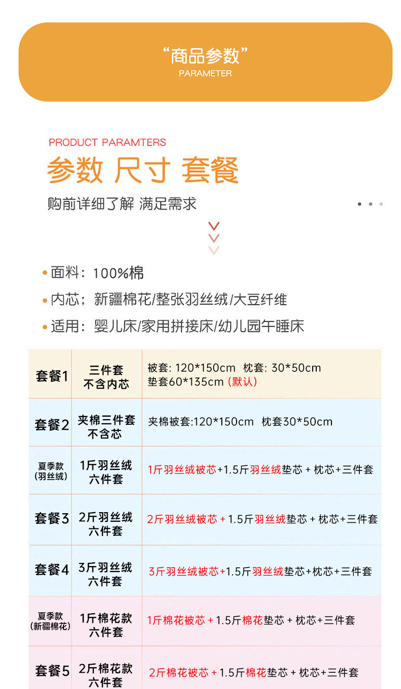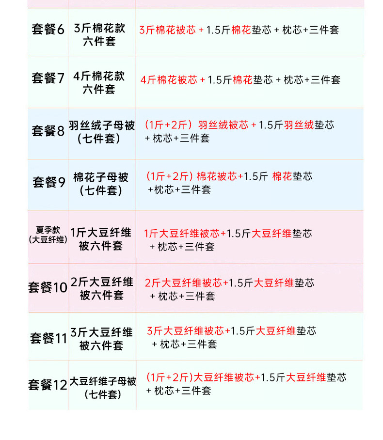 - Летняя модель (хлопковое хлопок с шестью частями) -1 кот из хлопкового стеганого одеяла+1,5 кот хлопчатобумажных колодок+ядро подушки+стеганое одеяло+прокладки+наволочки