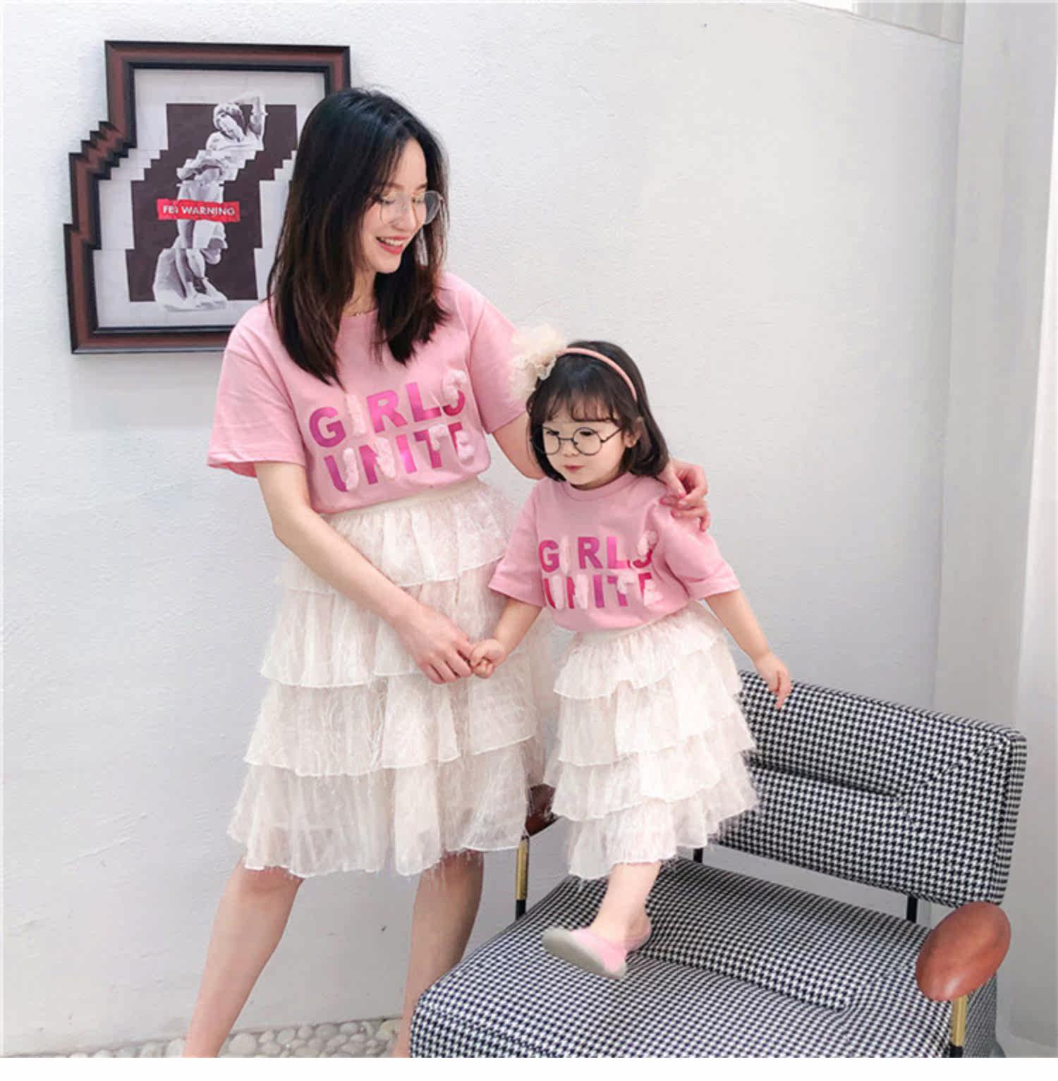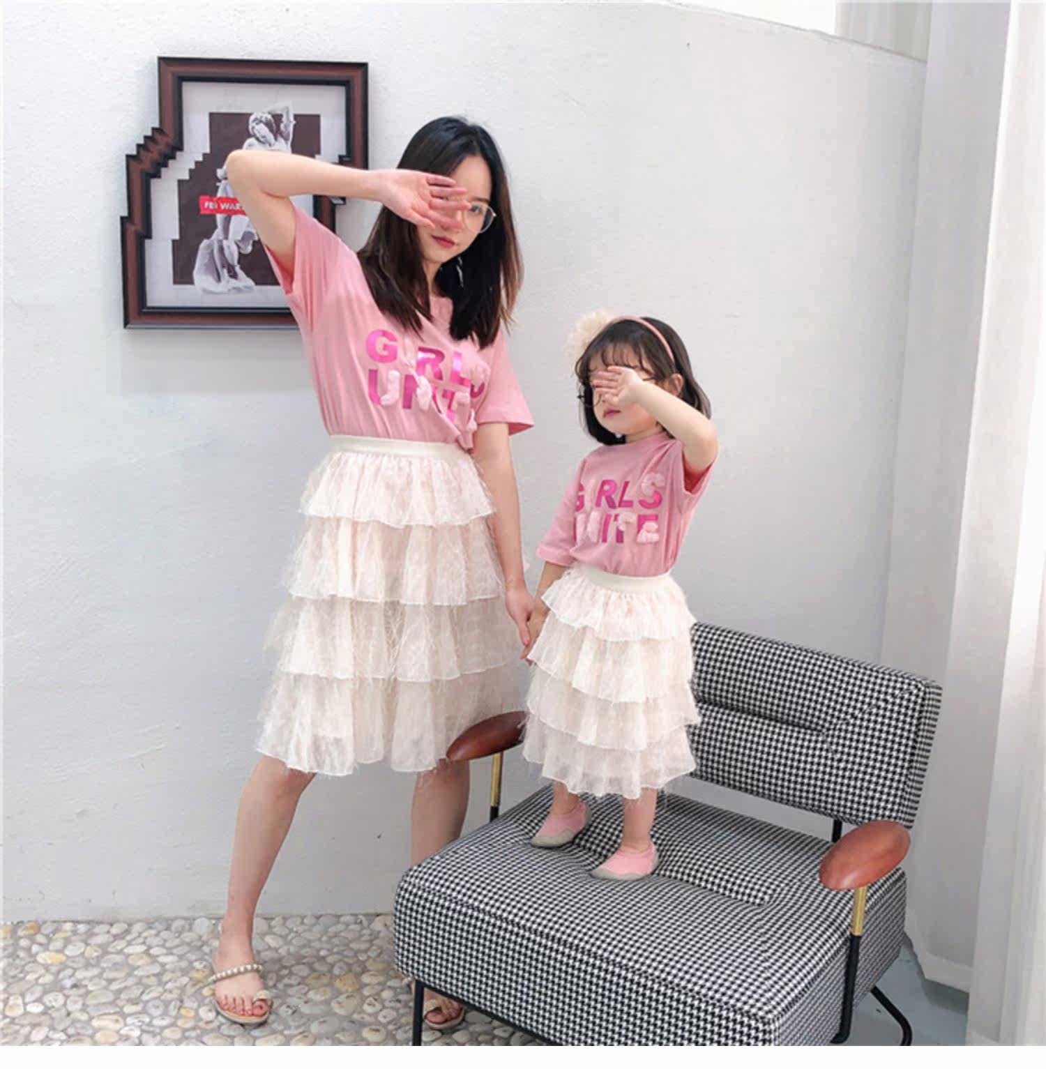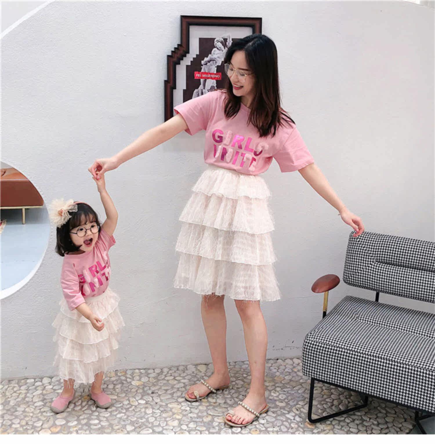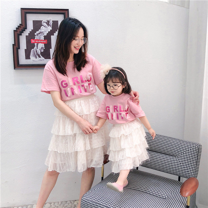 Розовые румяна, комплект, платье, юбка, летняя одежда, футболка с коротким рукавом, семейный стиль, популярно в интернете, в западном стиле, новая коллекция