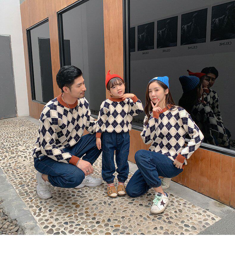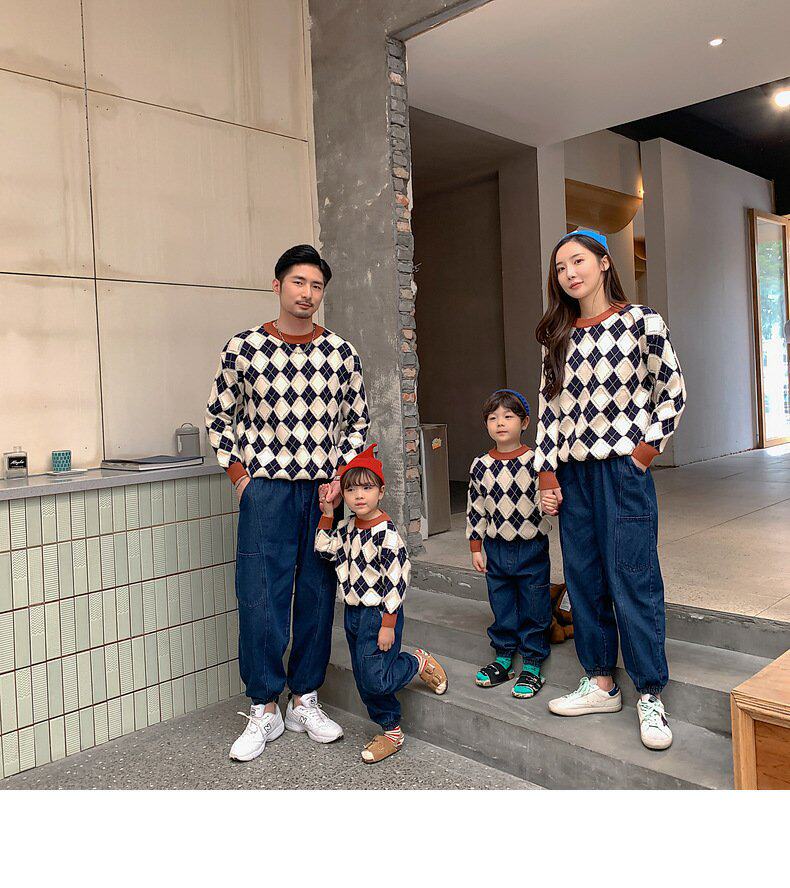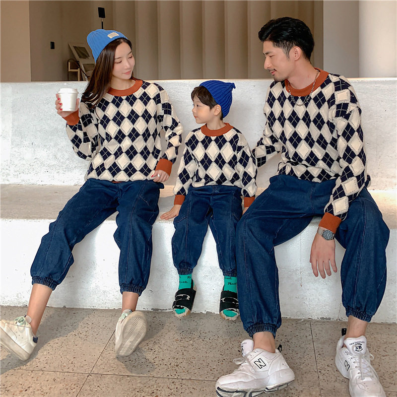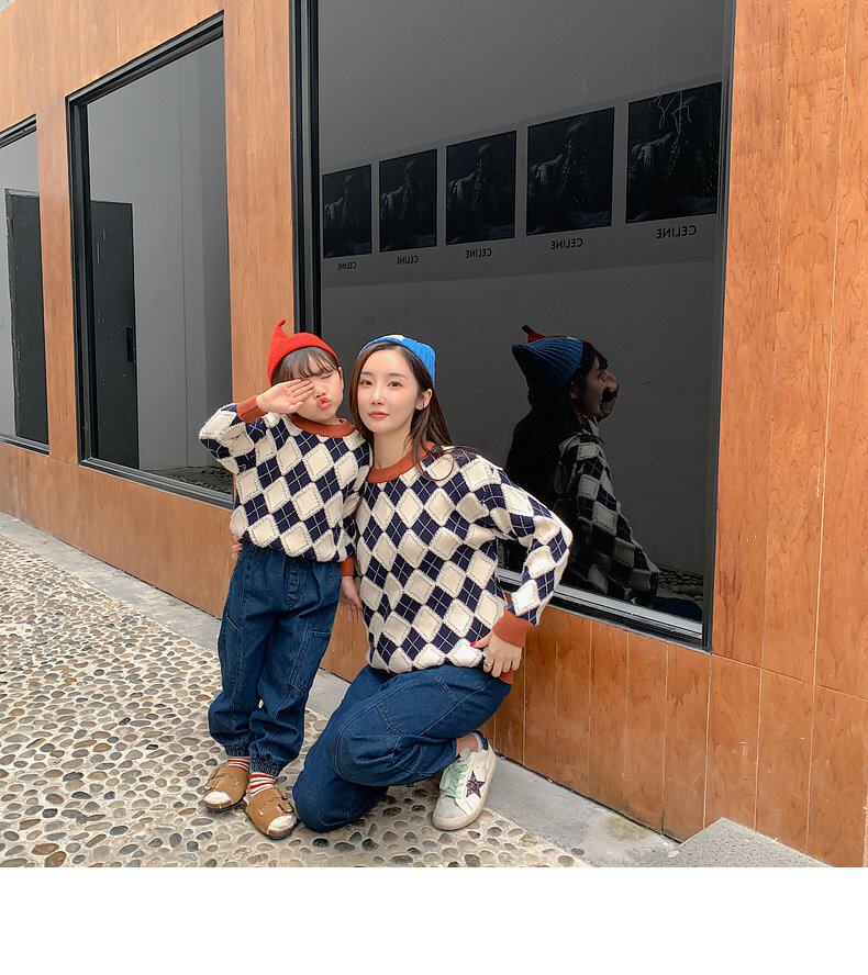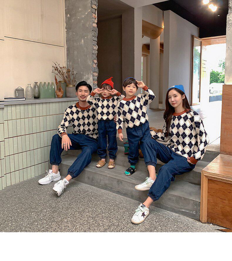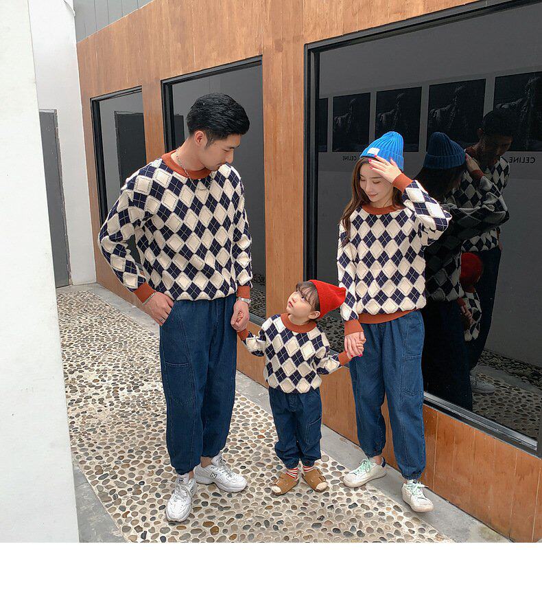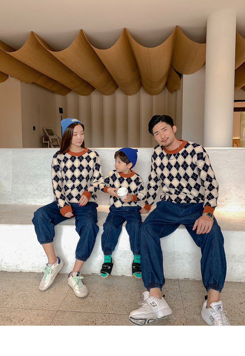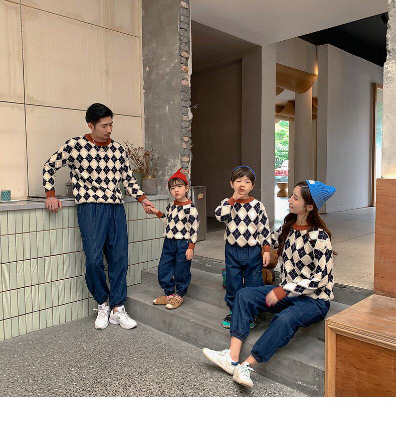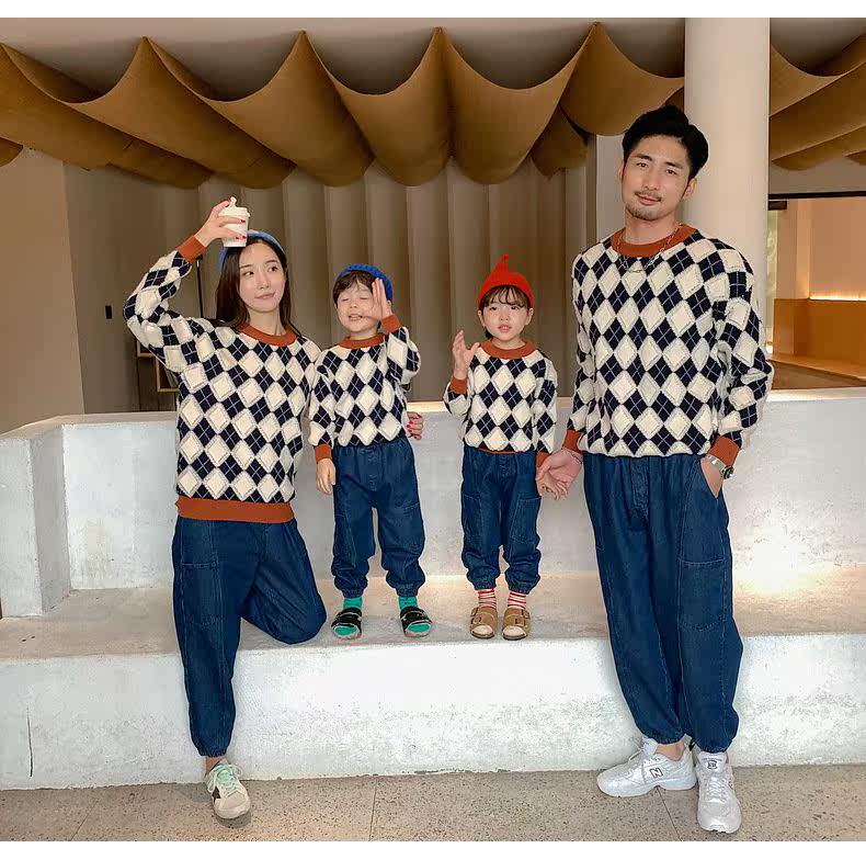 Демисезонный пуховик, свитер с ромбовидным узором, семейный стиль, 2022, популярно в интернете