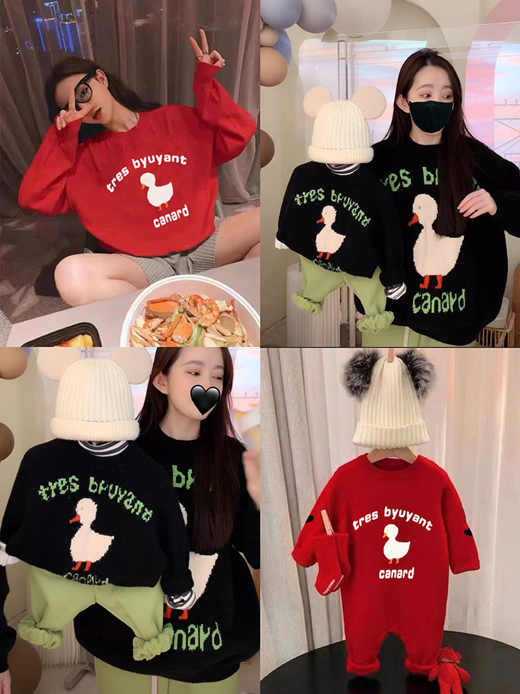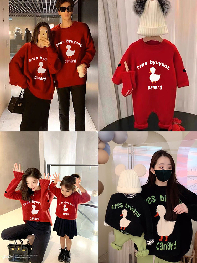 Пуховик, трикотажный красный свитер, в западном стиле, увеличенная толщина, семейный стиль