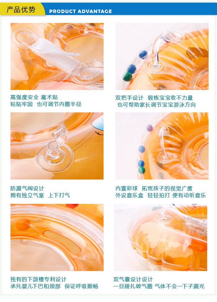 2. Уникальная эксцентричная внутренняя конструкция кольца характеризуется плавучестью задней части, чем спереди, что делает ребенка лучшим балансом в воде, и нелегко изготовить воду в задней части плавательного кольца и вызвать ребенка ушной канал, чтобы получить воду.