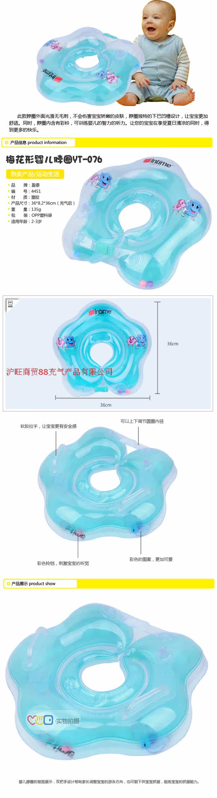 Помогите родителям скорректировать положение плавания ребенка.Вы также можете схватить ребенка и проявить способность понимать.Он изготовлен из материалов, которые соответствуют стандартам медицинского устройства, что не раздражает кожу ребенка; мастерство в мастерстве, поверхность плавательного кольца гладкая и без зарубнов вызвать визуальную стимуляцию для ребенка.