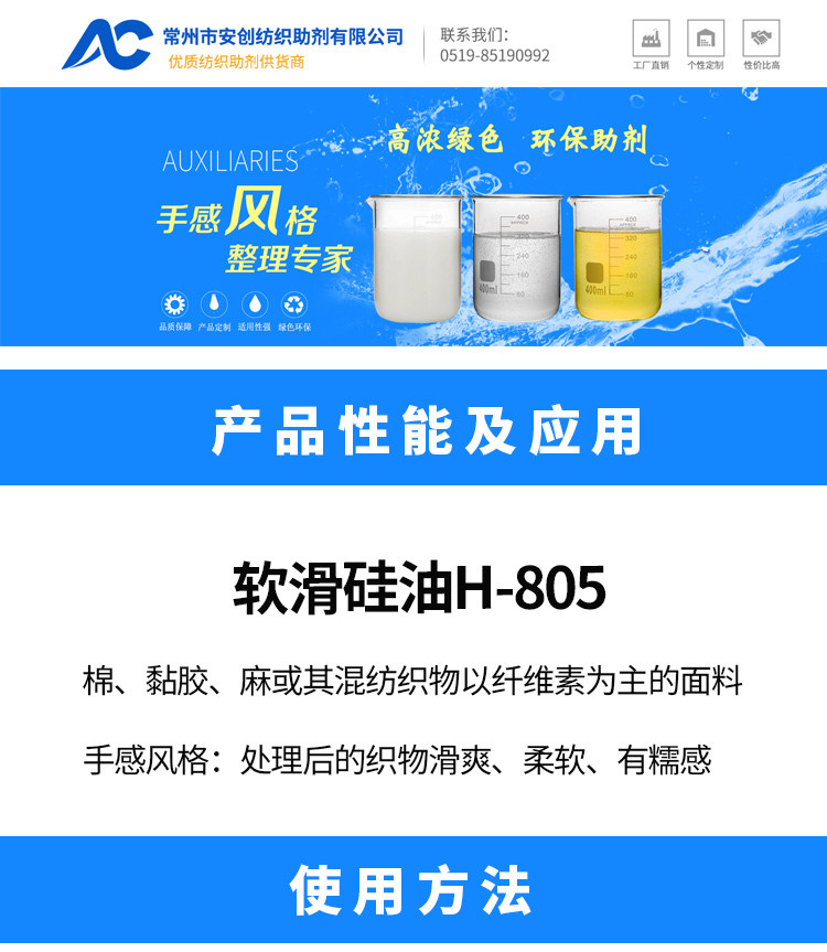 Анчо мягкое гладкое кремниевое масло H-805 Хлопок и льняный мягкий агент мягкий гладкий и освежающая рука ощущается хороший эффект длительный
