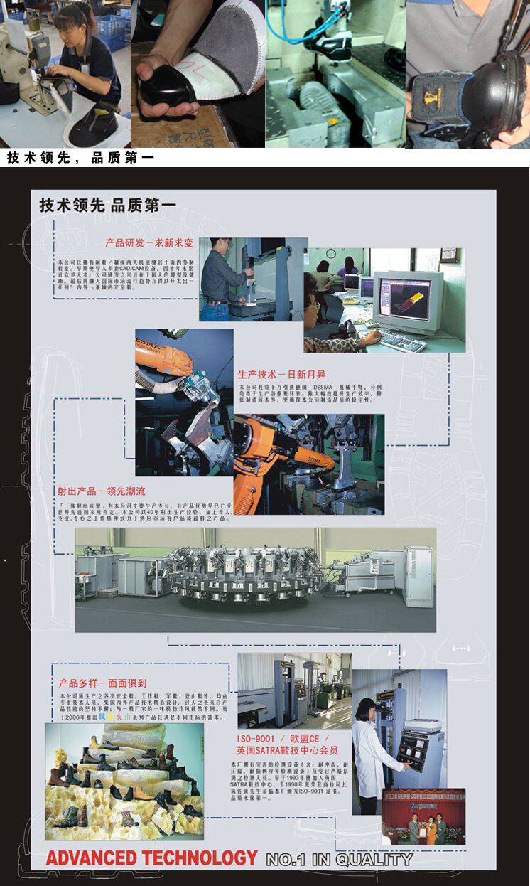 “Король”Каждая обувь каждого из них изучает и развивается через профессиональную и сосредоточенную на,После всех связанных экспериментов и тестов инвестируются в массовое производство;В части пальца ног используется европейская головка на свободной стали,Больше влияния,Долговечное давление;Верх;Подошва импортируется из ГерманииBASF(БАСФ)Защита окружающей среды Политамин материал.С рядом продвинутых Германии в миреDESMAОдин -в -одну обувную машину с выстрелом,И полный набор британских технологических центров обувных технологийSATRAПризнанное испытательное оборудование,Производственные и качественные инспекции100%Международный уровень.
