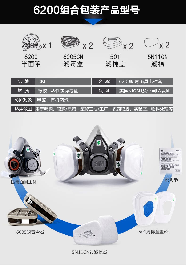 3M 6200+6005 Анти -вирусная маска с семи -частями формальдегида анти -вирусной маски органический пара эксперимент