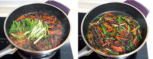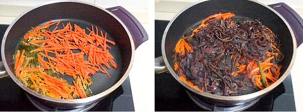 2. Нагрейте растительное масло в воке, перемешайте морковные клочки, когда 70 % масла горячая, а затем добавьте черные грибные клочки, чтобы жарить около 1 минуты