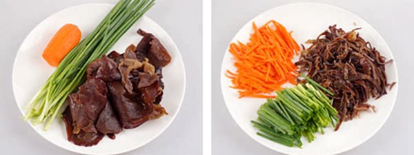 1. Замочите черный гриб, разрезайте его на шелк, разрезать морковь на шелк и нарезать шалот