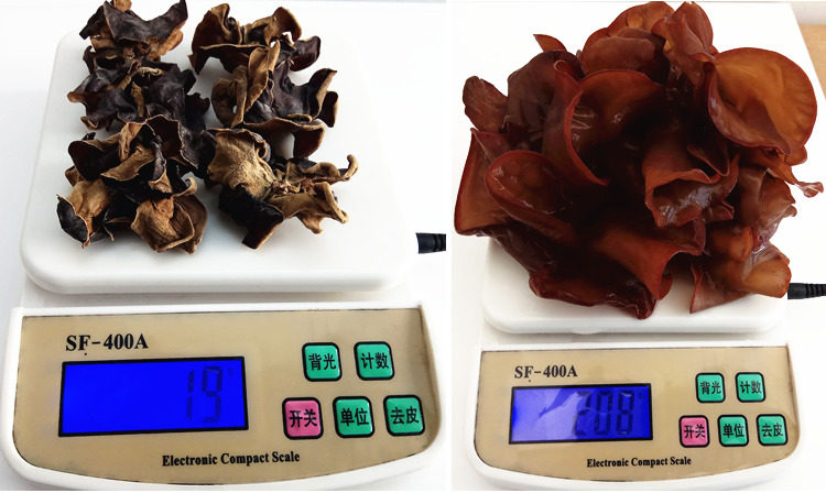 Содержание камедей диких грибов очень велико. 6 сухих грибов весят 19 граммов. После замачивания на одну ночь он становится 208 грамм. Пропорция замачивания 1:11.