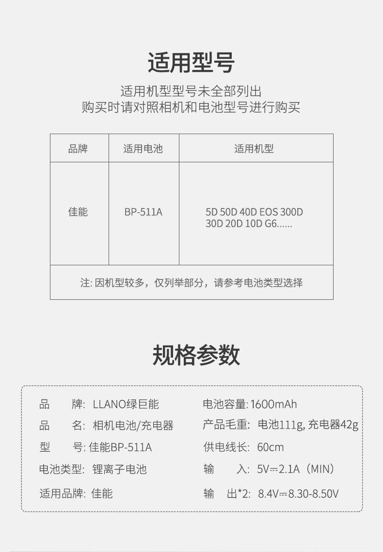 Зеленый гигант BP-511A Батарея камеры подходит для Canon 5D EOS 50D 40D EOS 300D 30D 10D 10D G6 SLR Dual-Charger USB Charger