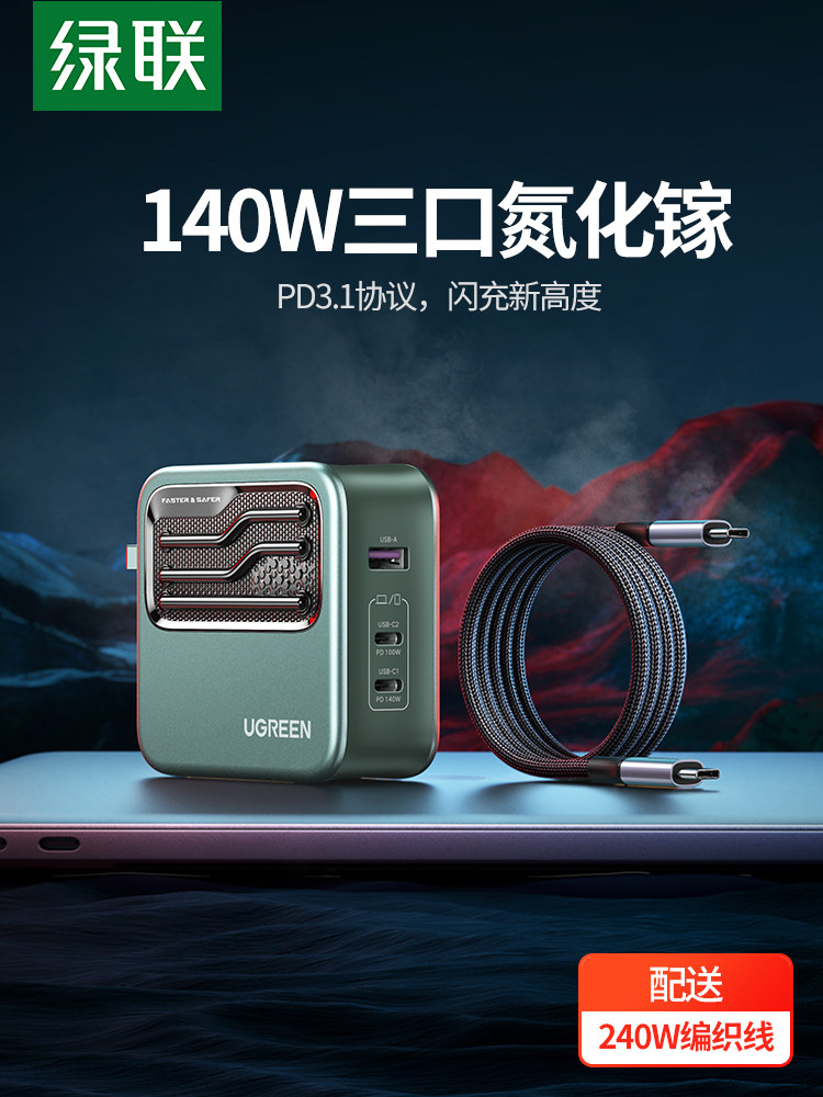[Тот же параграф с одноклассником] Green Union 140 Вт азота азота головы зарядного устройства PD3.1 Multi -Mouth Gan подходит для Apple MacBookPro Laptop 100W Mobile Dual Typec Plug 120