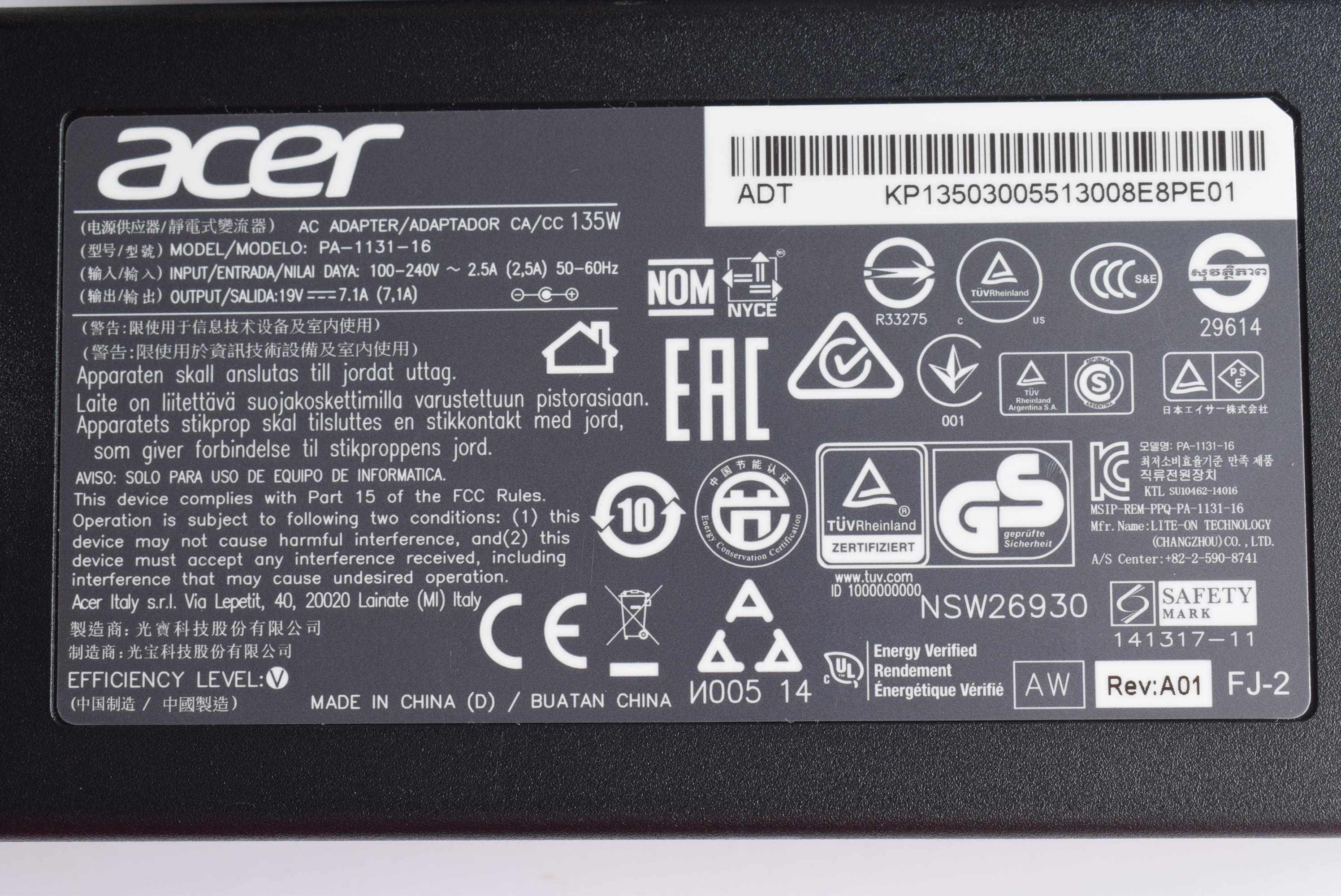 Применимо к оригинальному 135 Вт Acer Aspire v Nitro VN7-591G-50LW Power Adapter